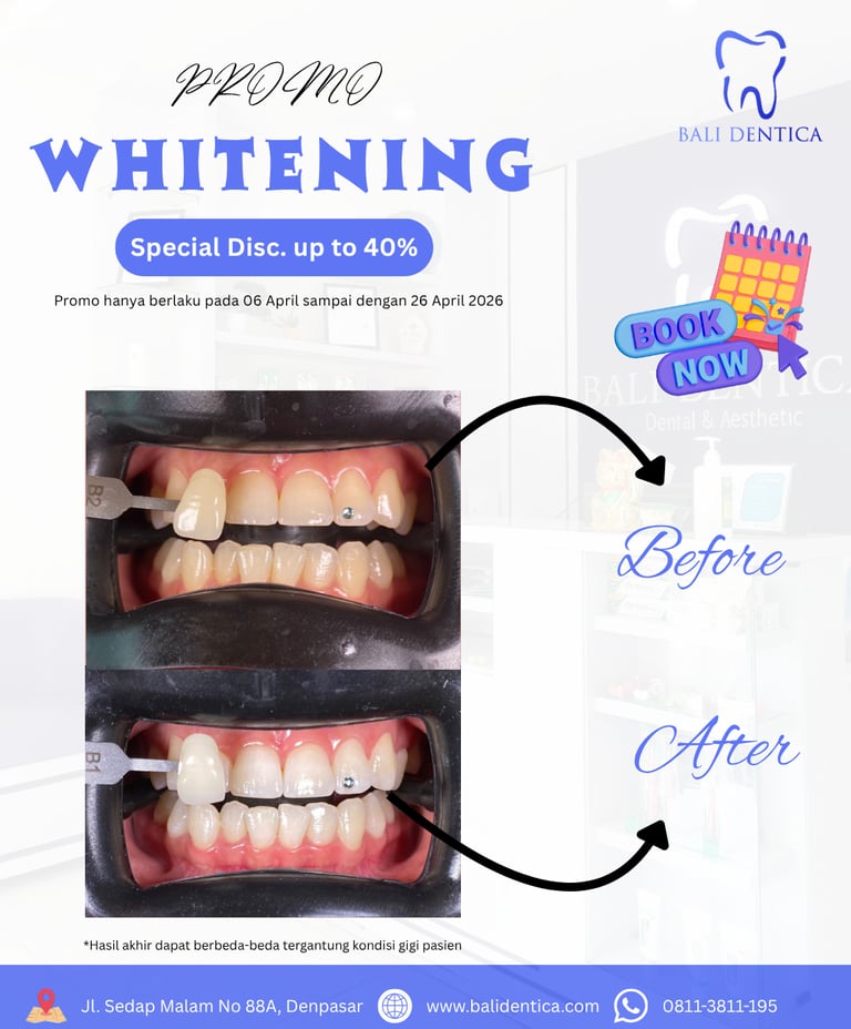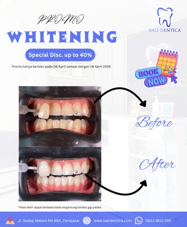 Klinik Gigi di Denpasar Bali — Nyaman, Profesional, Buka Setiap Hari. Dari scaling rutin, bleaching, veneer, hingga konsultasi kesehatan maupun estetika gigi — semua tersedia di satu tempat dengan dokter berlisensi dan tim yang ramah.